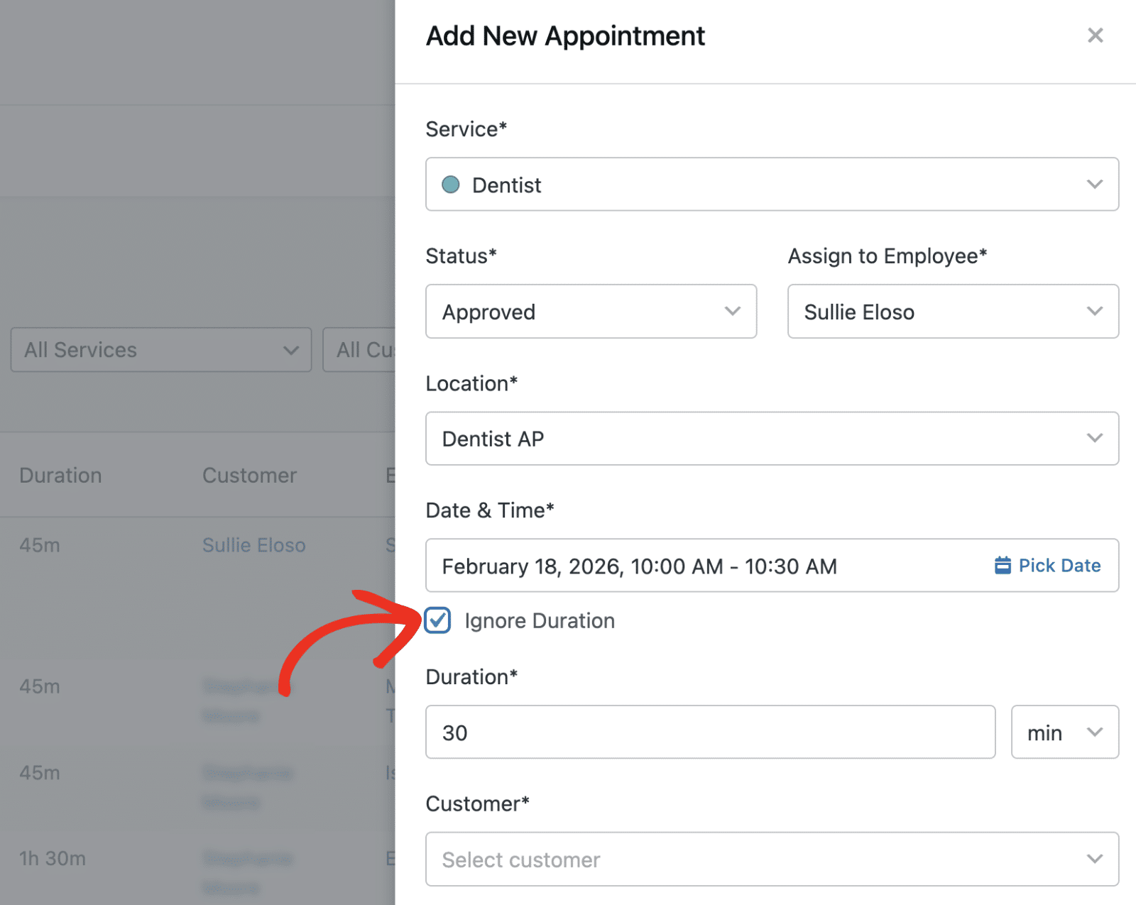 You can override the default appointment duration by checking the Ignore Duration box. Then specify the appointment time in the Duration field.