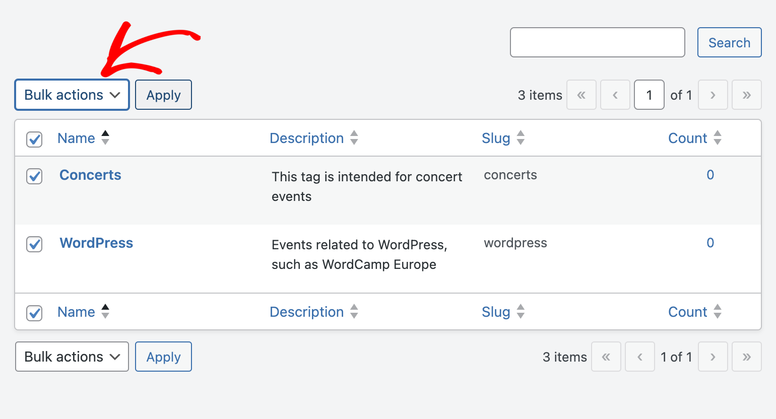 To delete multiple tags, check the option to select all tags and click the Bulk Actions dropdown.