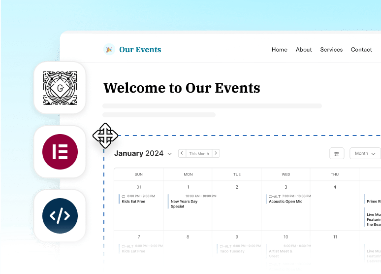 Sugar Calendar offers ready-to-use blocks for Gutenberg and Elementor, along with easy-to-use shortcodes